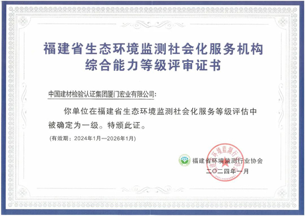 福建省生態(tài)環(huán)境監(jiān)測(cè)社會(huì)化服務(wù)等級(jí)評(píng)估一級(jí)